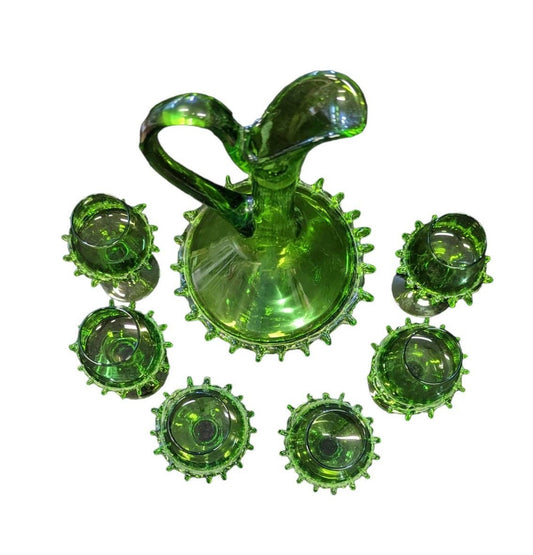 Handblown Green Glass Pitcher and 6 Goblets - Made in Czechoslovakia - BoHo Style - Bohemian Glass