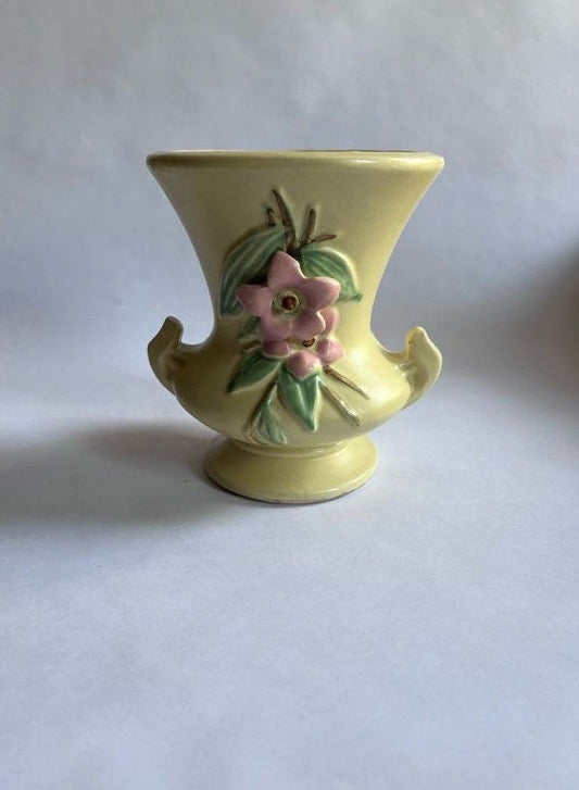 McCoy Blossom Time Yellow Pottery Vase - Raised Pink Flower Decoration - Vintage 1940s Pottery