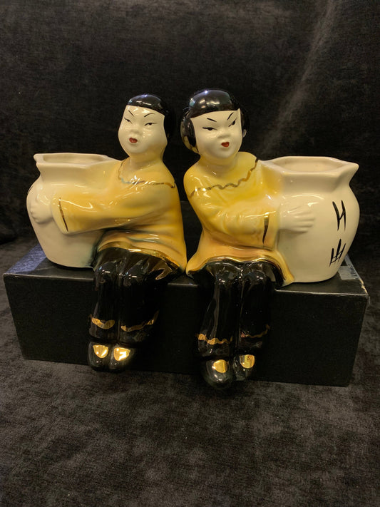 Set of Shelf Sitters with Vases - Japanese Couple on Benchs with Vase - Vintage Ceramic Figurines