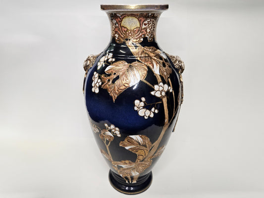 Japanese Cobalt Satsuma Kinkozam Vase with Kenran-de (Gold Paint) on Decorative Relief- 1910 - 1920 Meiji Period- 12.5" w/Elephant Handles
