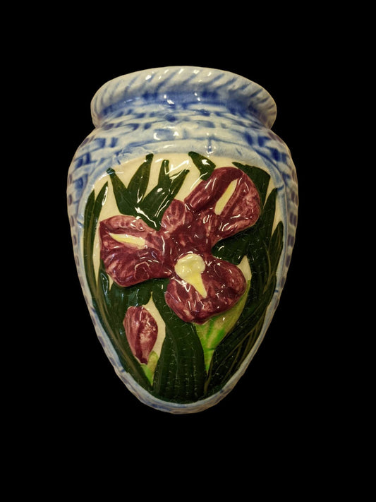 Burgundy Iris Surrounded by a Blue Basket Weave Vase - Vintage Wall Pocket Made In Japan