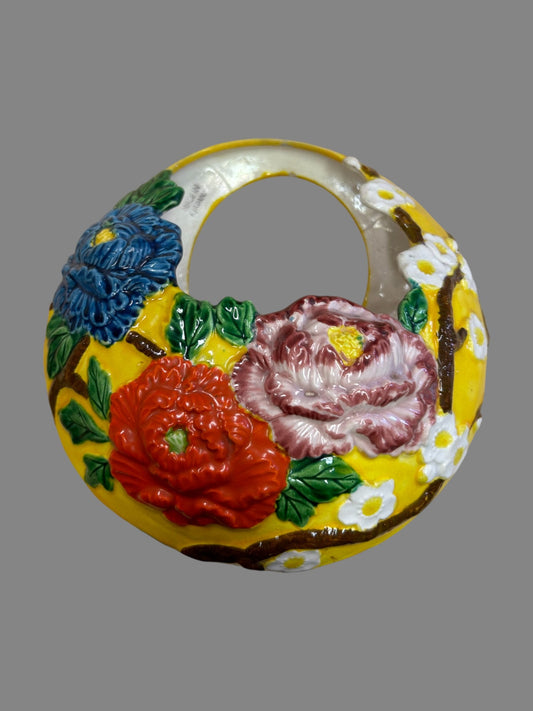 1940's Majolica Floral Hanging Pocket- Made in Japan - Bright Dynamic Colors - Hanging Porch Decoration - Peony Blossoms on Hanging Pocket
