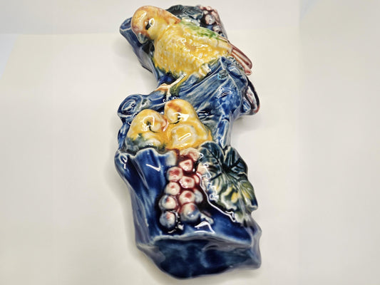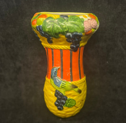 1950s Ceramic Wall Pocket with Grapes and Bird - Bright Hand Painted Wall Pocket - Kitchen wall Decor- Porch Wall Decoration
