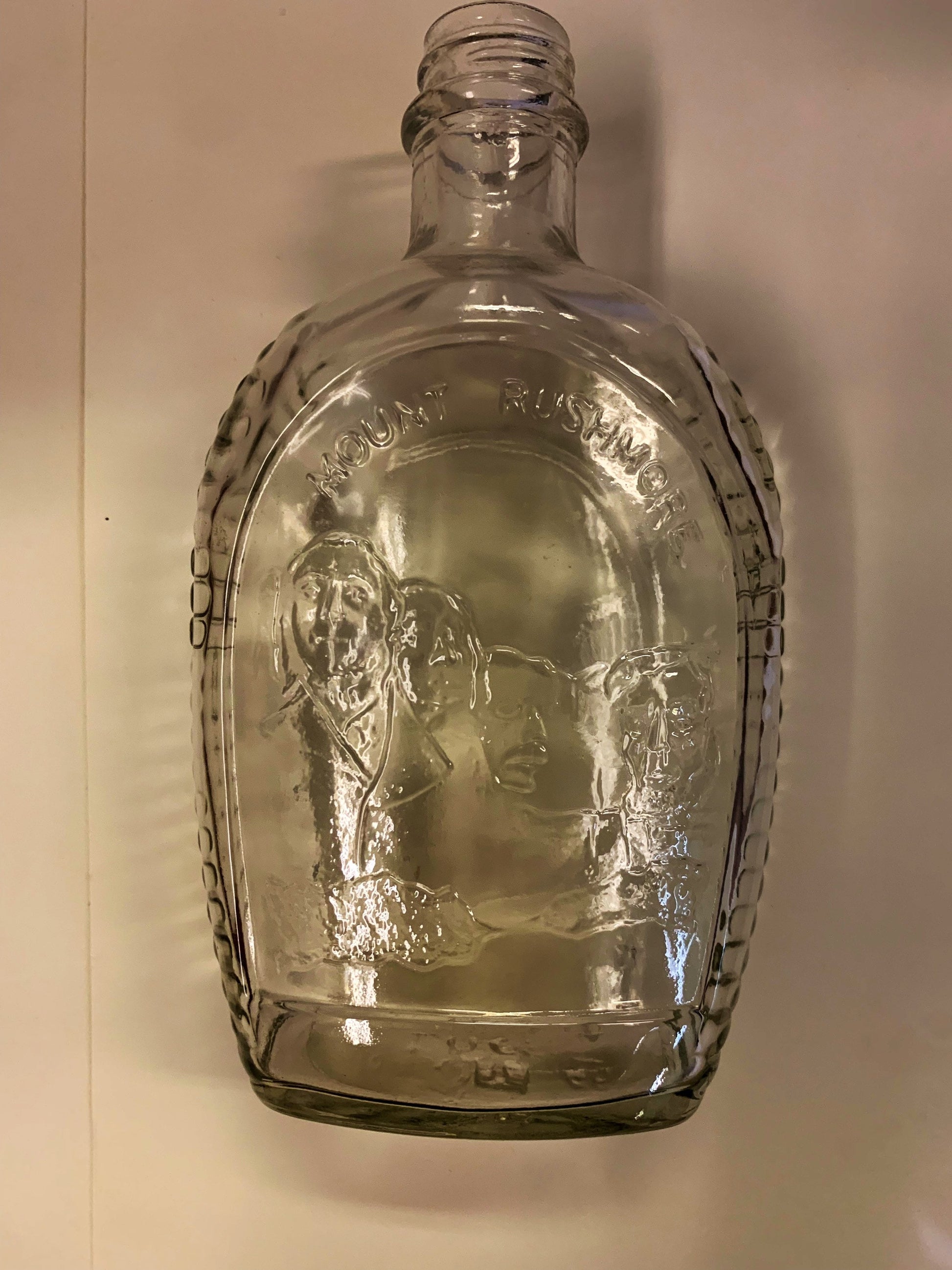 This bottle was made by Log Cabin Syrup for the bicentennial 1776 - 1976 celebration of the United States' Independence. The bottle has and embossed image of Mount Rushmore. Log Cabin has produced maple syrup, in Minnesota since it was founded in 1887. The bottle is in excellent condition with no chips or scratches. The Log Cabin company has sold it's product in clear glass or amber glass bottles.
