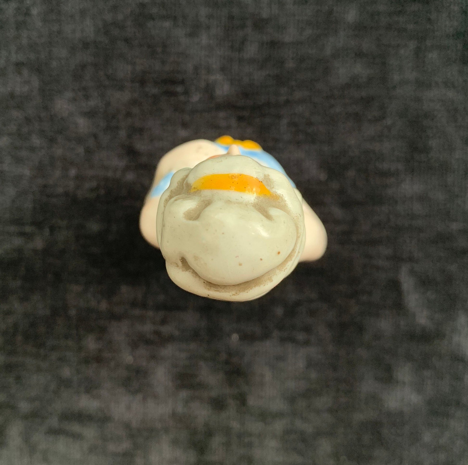 A beautiful bisque figurine of a lovely lady! Except she is missing the original horse hair brush she crowned. Her hand painted features are still vibrant and beautifully in tact (see photos). There are a few tiny flecks on her which may have come with use. The lady figure originally was the top of a whisk brush, which would have been used for road dust, lint, crumbs, or by barbers to remove hair from client's clothing. Designing these brushes with bisque or porcelain figures was popular in the mid to late 1800s continuing well into the early 1900s. The figure has an impressed marked with the word “Germany” on the back of her waist and below that the number.55'57 she would be a great addition to a collection of brush toppers..