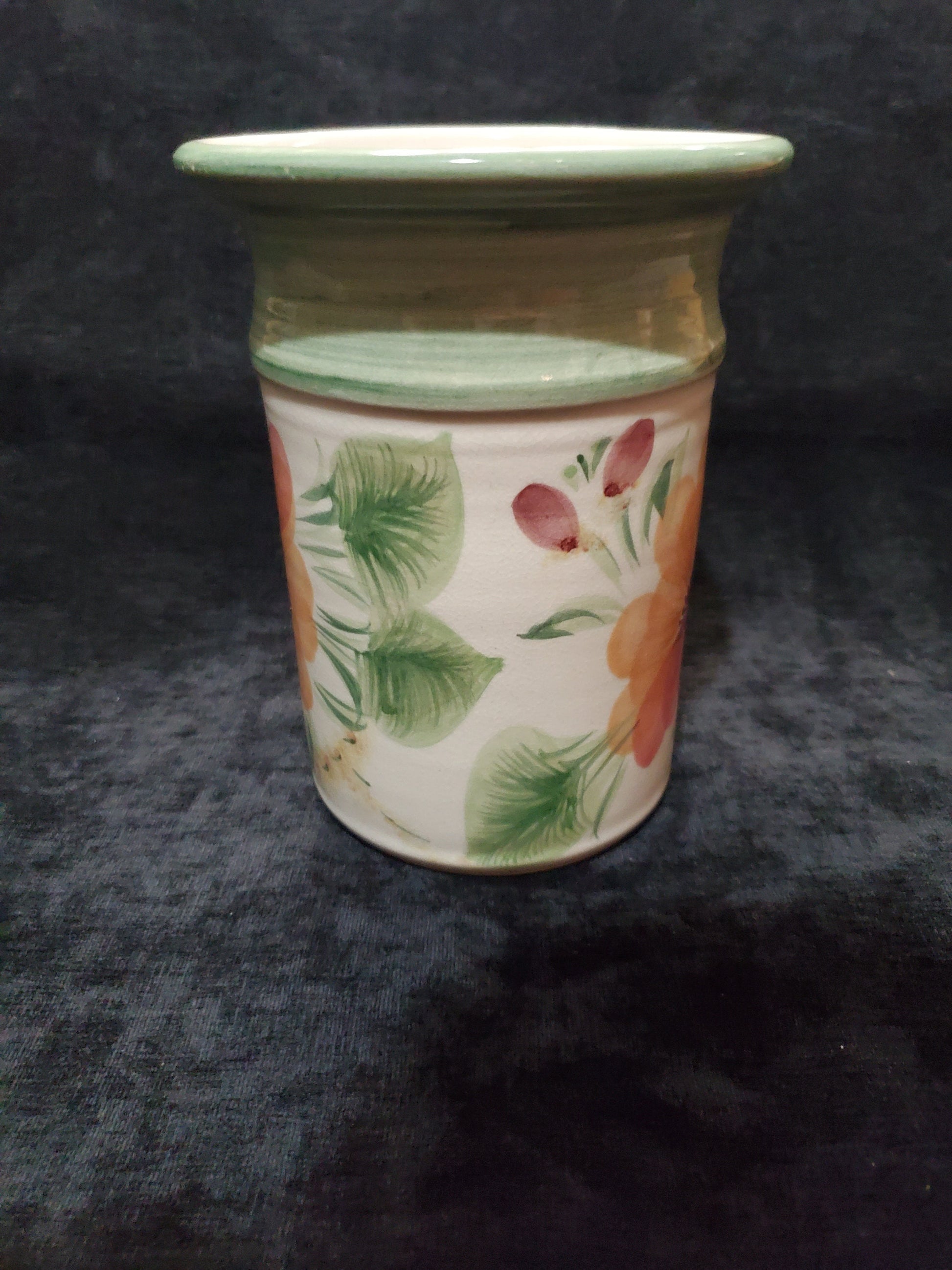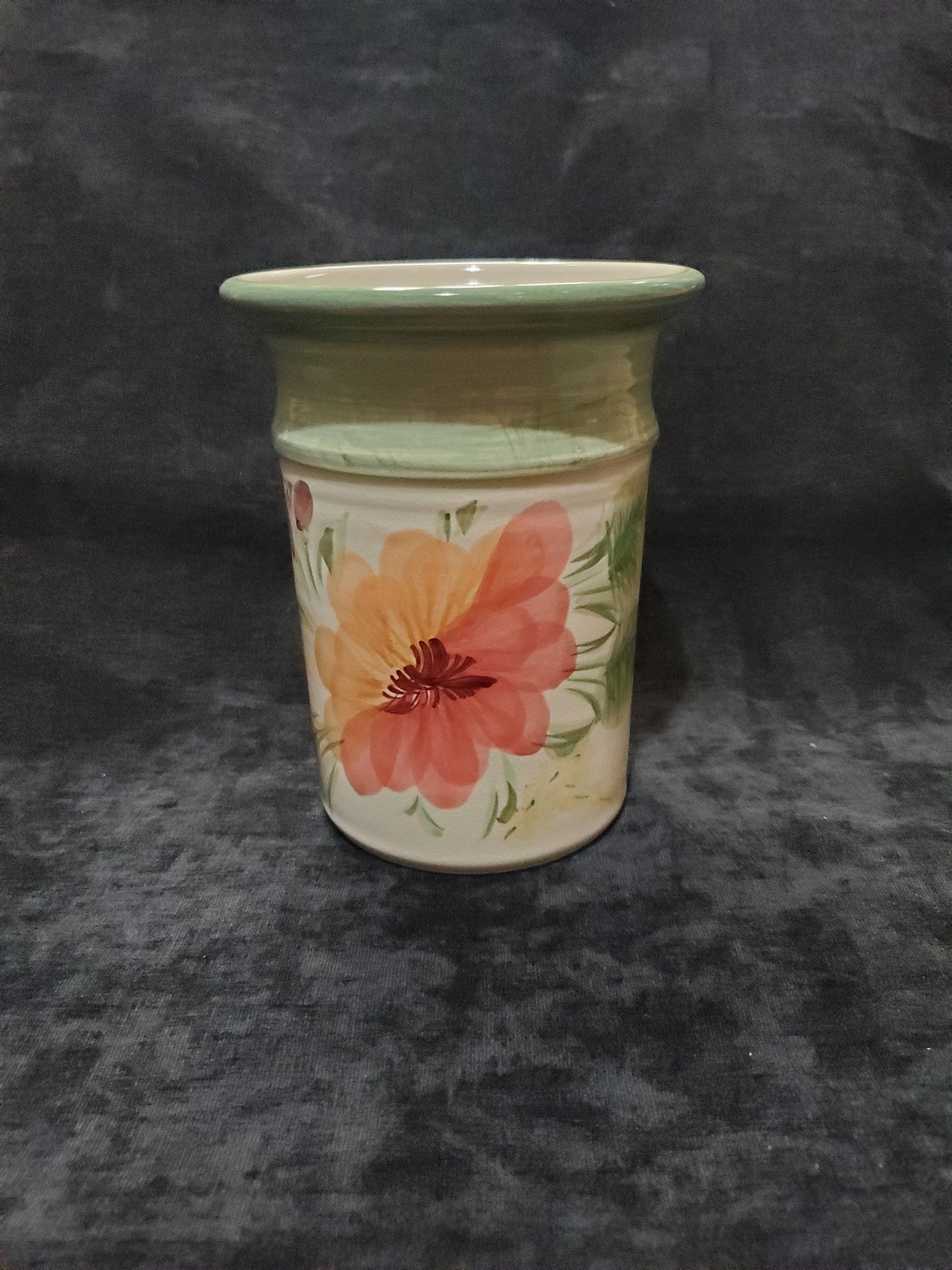 This lovely hand made vase from the 1970s is in perfect condition as it was never used. It is as found in a gift box. It has no markings but it is obviously hand made as the turning rings can be seen on the interior. The hand panted exterior is obviously late 1970s primary colors. A bunch of summer flowers would look terrific in this lovely and fun vase.
