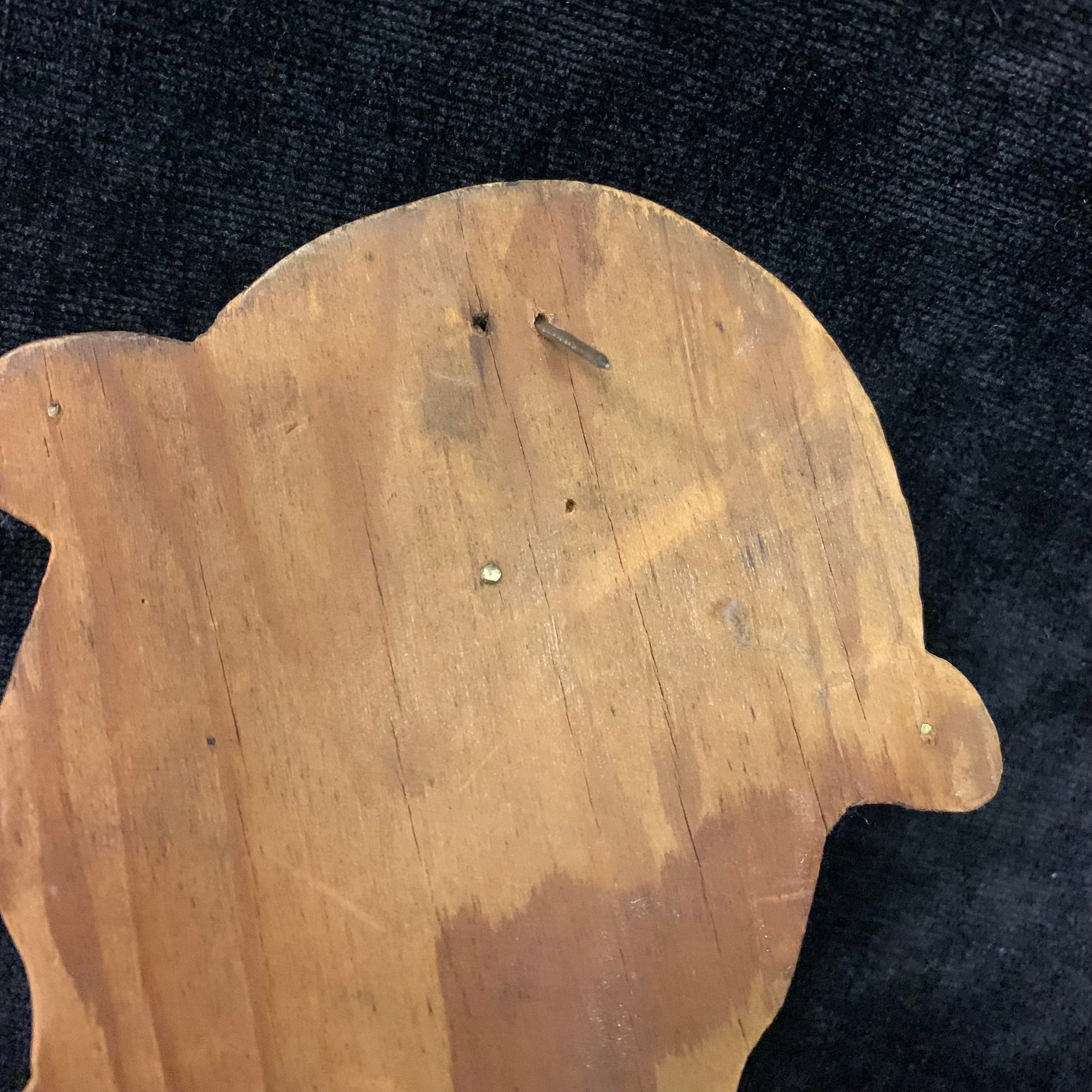 This is a 1950s wooden Key Keeper (hanger) or wall decor featuring a caricature of duck wearing suspenders and a hat. The Duck is hand carved and hand painted. It has small hooks on it to keys or jewelry. The very top has a hole to nail it into the wall or other fixture. Overall, this piece is in great vintage condition. The paint is uniform and does not have any chips. There is just a little sticky residue on the bottom portion of the duck. It will easily clean up. Has a great Farm house look.