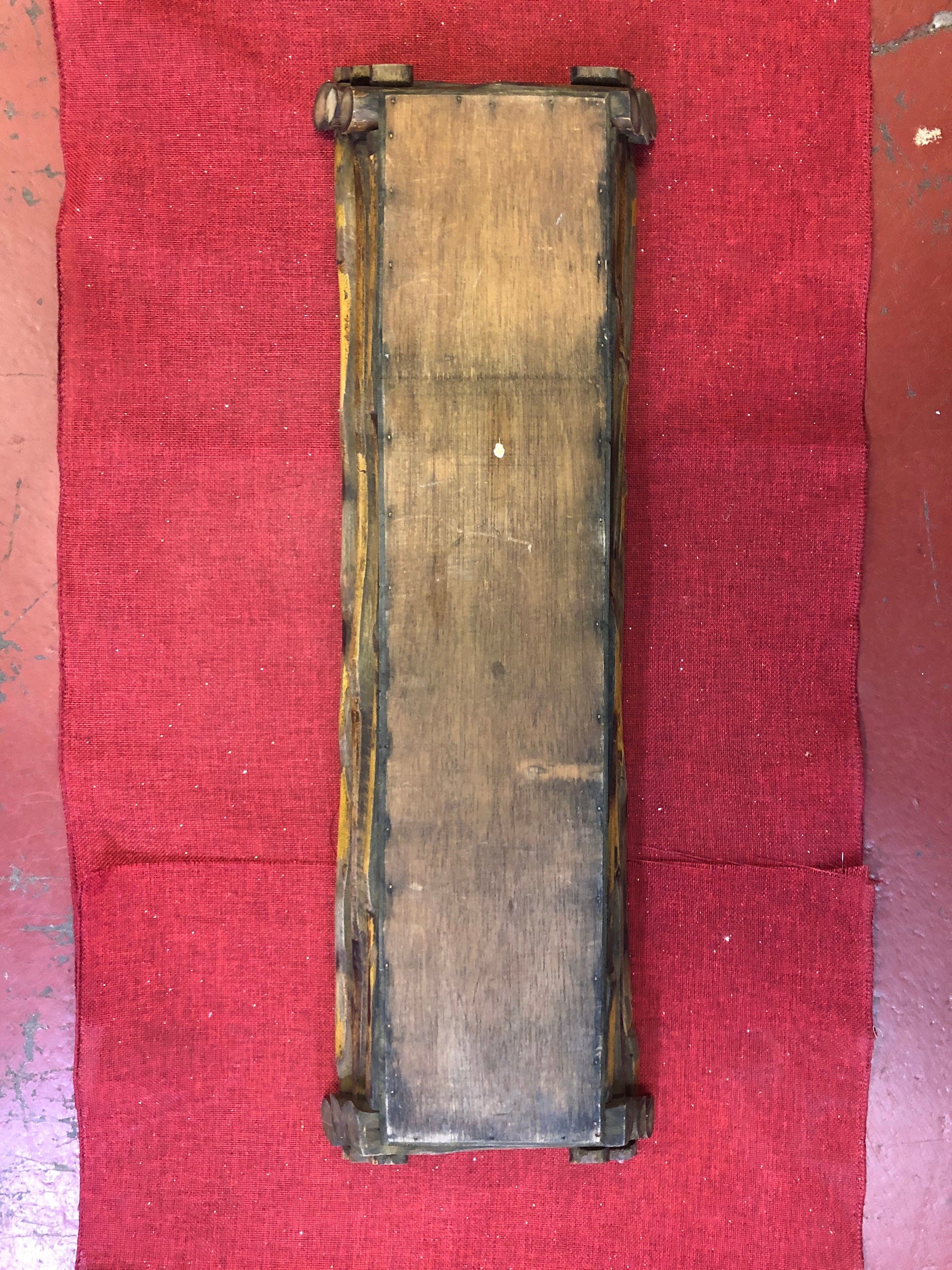 This classy basket is made of bamboo, made in the late 1910s/early 1920s. It has a woven bottom, handmade with nails holding it together. It is a deep and elegant brown with lighter colorings around it. It would be perfect for your living room on the mantle or on an ottoman.