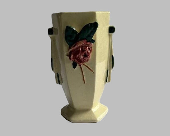 Charming Creamy Pale Yellow Vase Made by McCoy Pottery. It has a single Maroon Rose With Dark Green Leaves and Art Deco Style Handles With Dark Green Accents. It is part of the Blossom Time series created by McCoy Pottery. This small vase would be very pretty on a desk or a dresser, or part of a grouping. Six inches High, perfect for a very small nosegay. There is crackling in the glaze which is typical for McCoy vintage vases