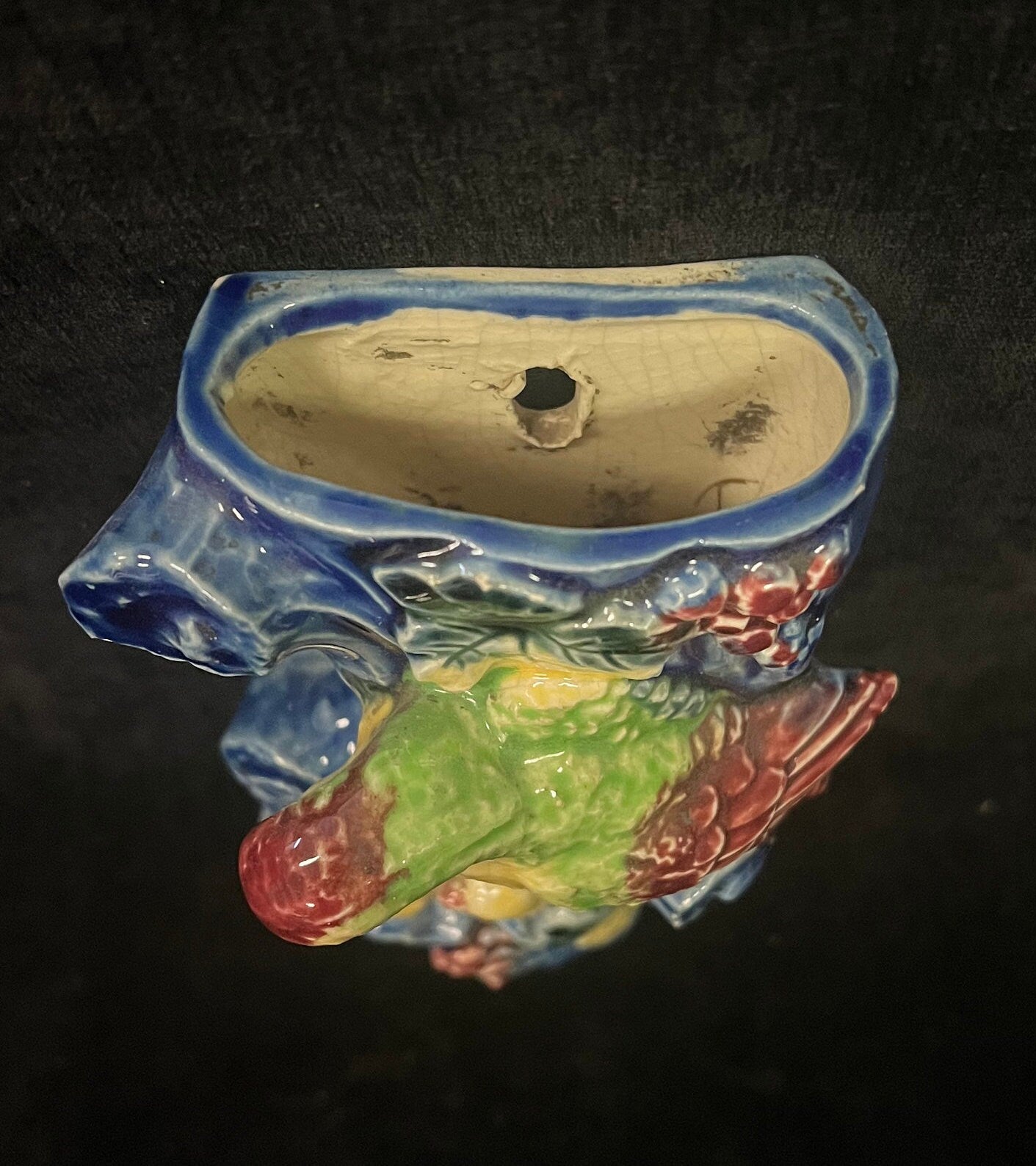 These colorful vintage ceramic wall pockets would make a wonderful addition to any room, hallway or porch. The smaller, left one, features a beautiful Parakeet with some Strawberries below. The bigger, right one, features a beautiful bird with chick additions. These pieces are in excellent condition, with no chips or cracks. They would add great color to a collection of wall pockets on a porch or kitchen wall. Wall pockets just love the company of other pockets...they create interest and conversation.