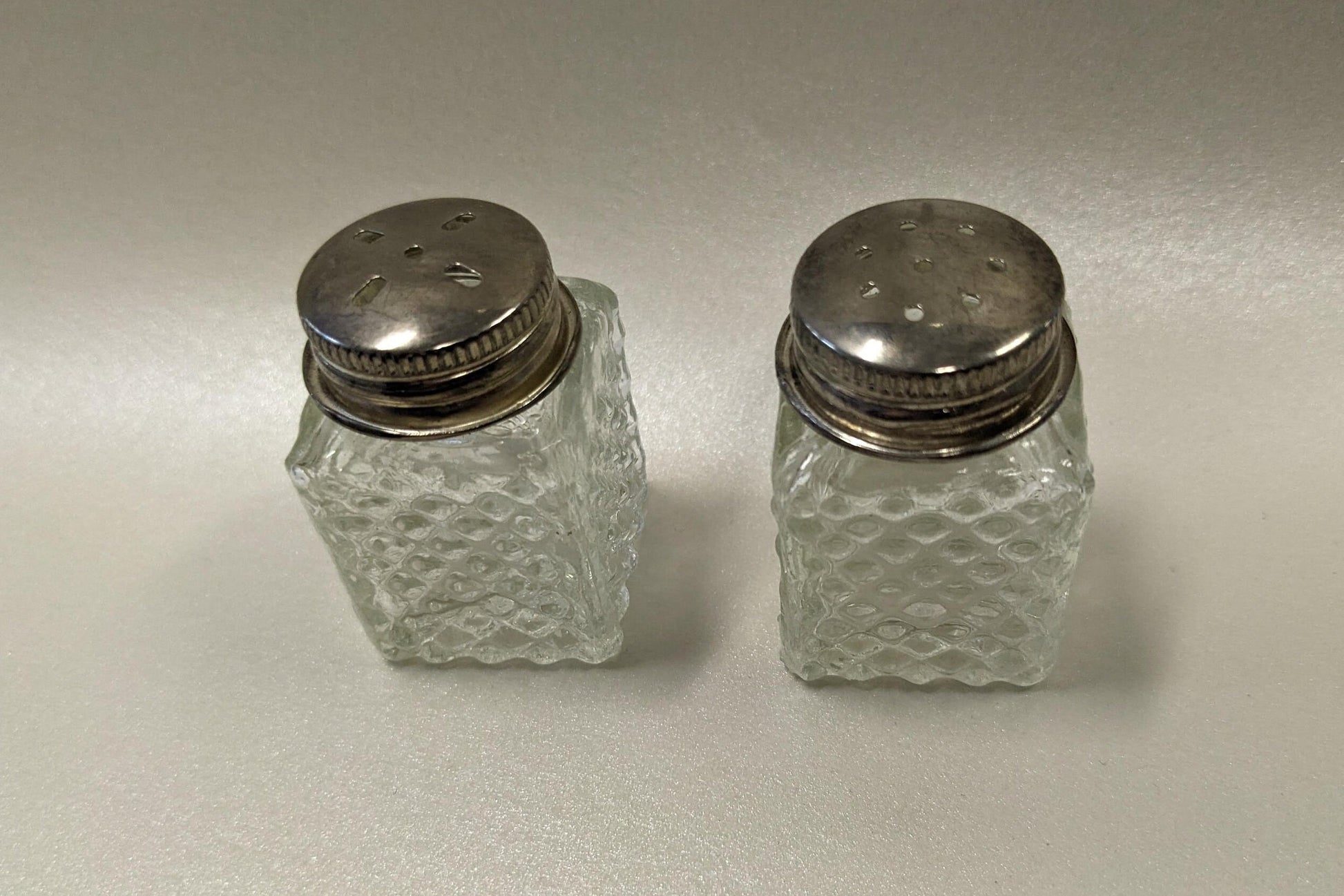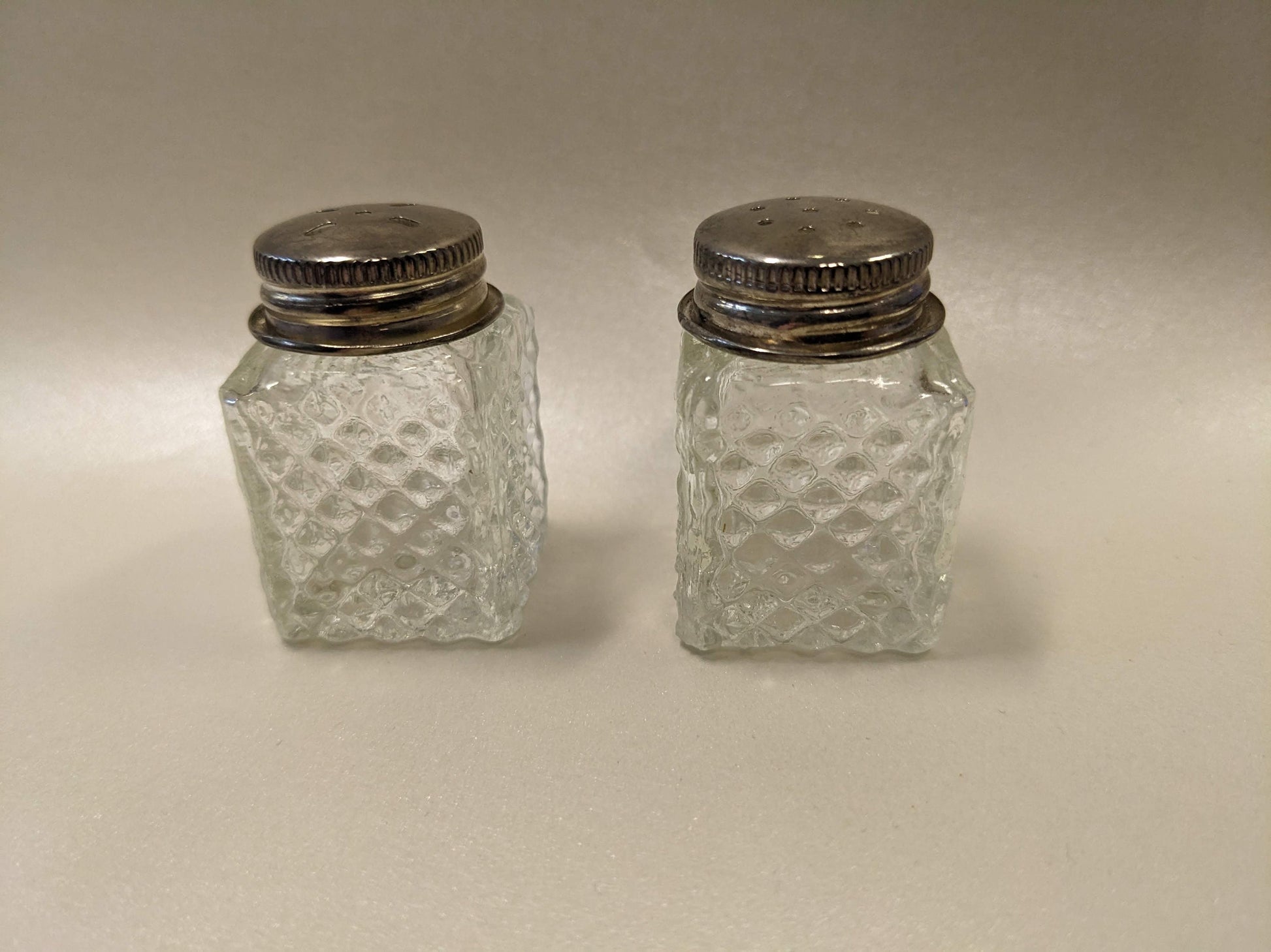 Perfect to add to the tray when serving breakfast in bed, or if someone in the house is ill and needs to have dinner on a tray, these cute glass mini Salt and Pepper shaker set would be handy to own. Silver toned metal on the lids is slightly tarnished. Would probably clean up nicely (place in foil lined dish with baking soda add boiling water, agitate with a fork). They are Vintage from the 1930s. They measure about an inch and a half tall and each side is about an inch long. **Our antique items will naturally have signs of wear, age, and production imperfections. We will mention any cracks, crazing, or chips in our descriptions. We consider our photos to be part of our descriptions, so please thoroughly examine our photos for any imperfections we may have missed. Questions welcome. Thanks for shopping!