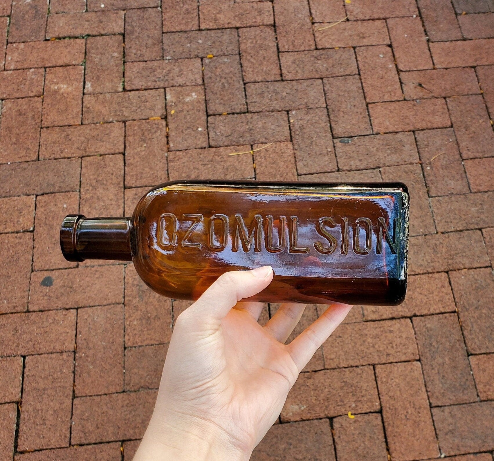 As the 1890s ended TB was a feared disease, cities built special "homes" for those afflicted with this serious illness. The patients were moved into these residential care facilities to receive care and rehabilitate. Literally thousands died from the disease. Many early pharmacologists, and would be pharmacologists concocted remedies and sold them under different names. This bottle was labeled "Ozomulsion" and promised to Cure the pulmonary disease Tuberculosis. The bottled cures began to show up in the late 1880s and still were being sold as late as 1948. This bottle originally had a cork held on by a wire. and was made in about 1890.