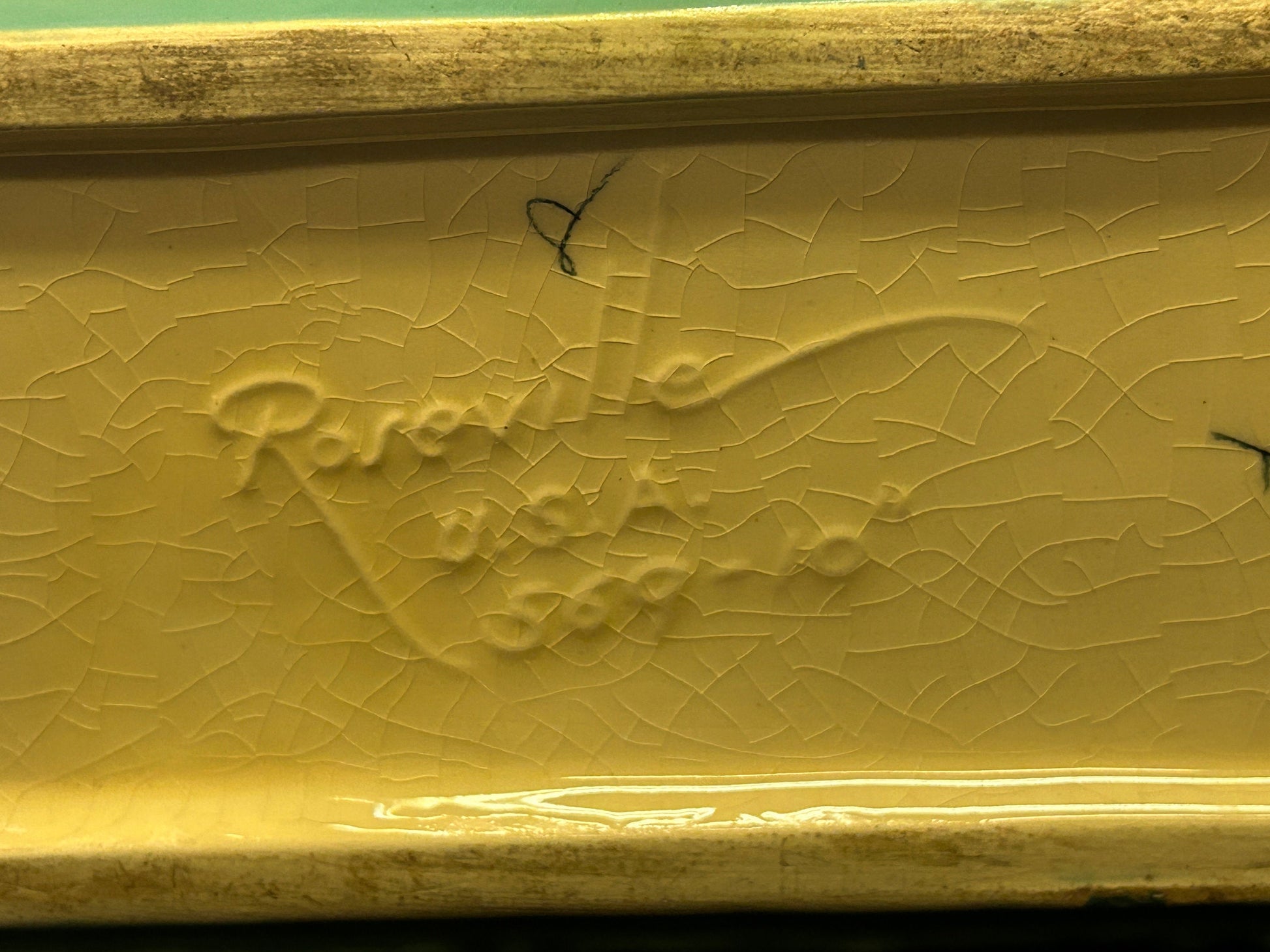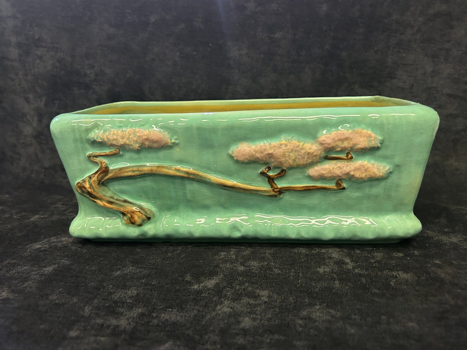 This planter was made by Roseville Pottery in 1949 as part of their Ming tree line. It is shaped in a rectangle. It measures 4.25" tall, 11" long and 5" wide. It is signed on the bottom Roseville USA with the model number 568-10.